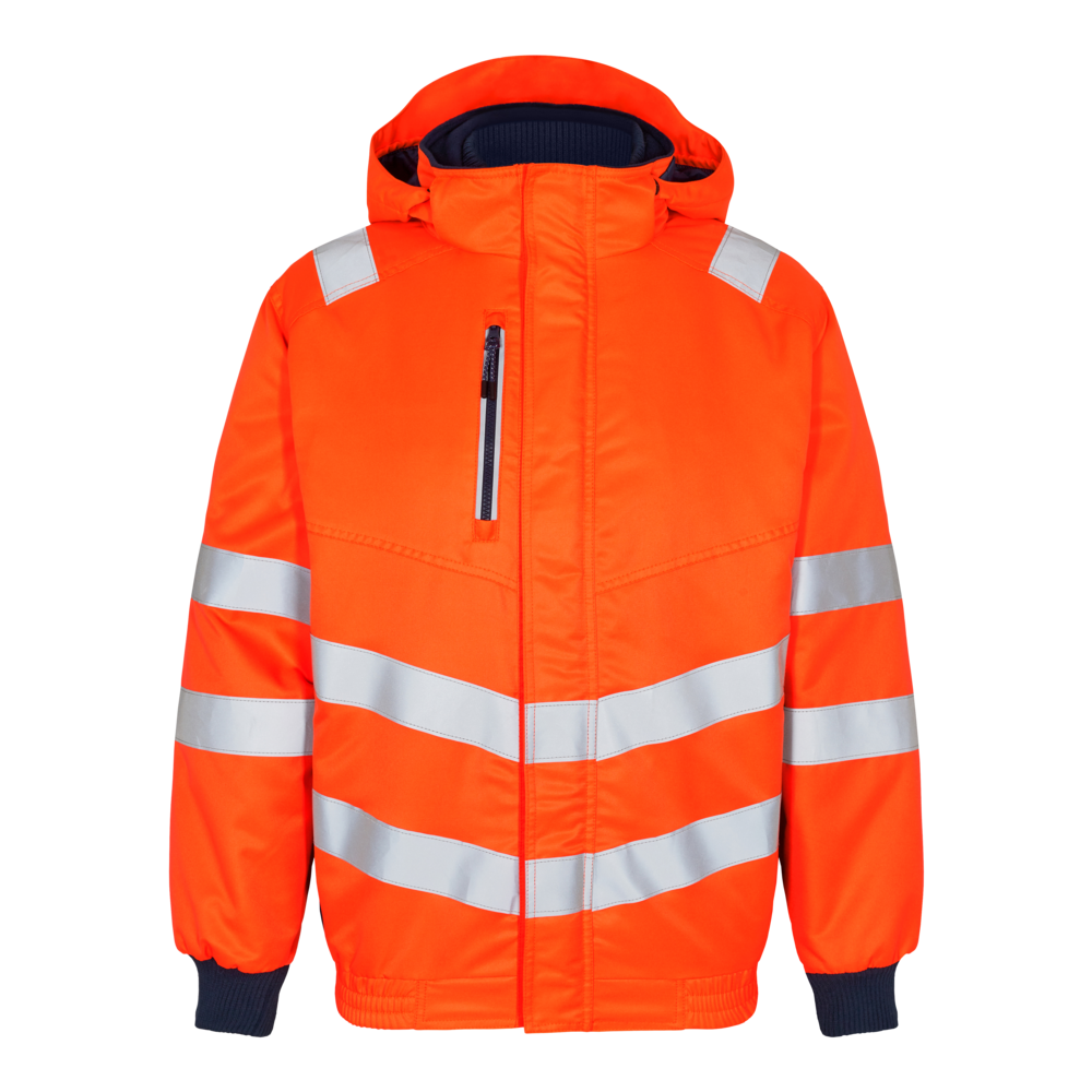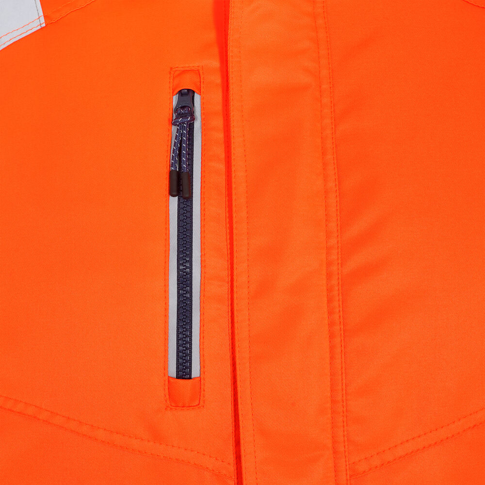 Modern kesimli, floresan rüzgar ve su geçirmez pilot ceket. İçi polarlı yüksek boyunlu. Önde fermuar ve Velcro ile çift patlet kapama. İki geniş yan cep ve Velcro kapamalı göğüs cebi. Biri fermuarlı olmak üzere iki iç cep. Ayarlama seçeneği ve güvenlik kaskı için yeri olan çıkarılabilir başlık. Alt kısmı lastikli, bilekleri ribanalı. Baskı transferleri/nakış için ön tarafta fermuar. Omuzlarda, kollarda ve belde reflektörler. 25 yıkamadan sonra test edilmiştir.