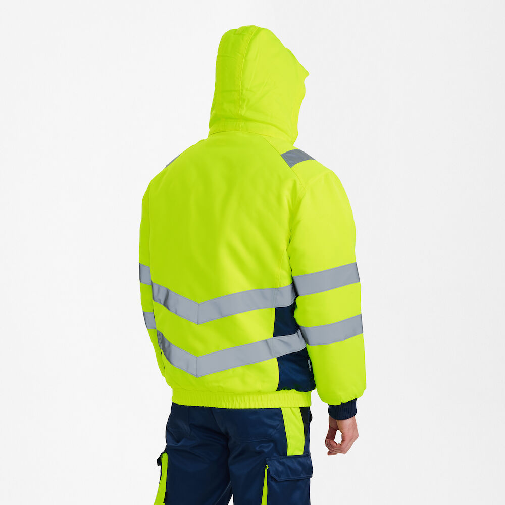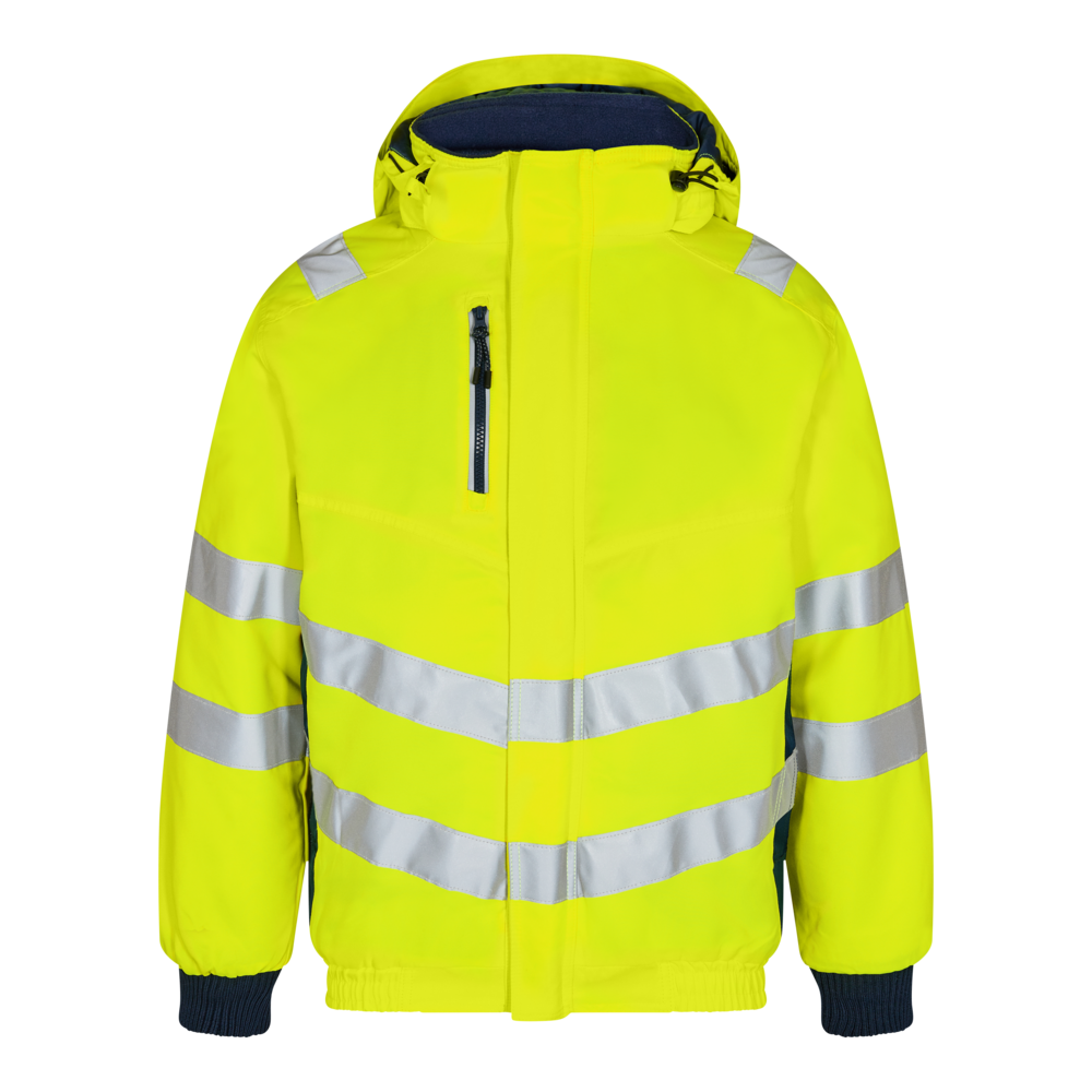 Modern kesimli, floresan rüzgar ve su geçirmez pilot ceket. İçi polarlı yüksek boyunlu. Önde fermuar ve Velcro ile çift patlet kapama. İki geniş yan cep ve Velcro kapamalı göğüs cebi. Biri fermuarlı olmak üzere iki iç cep. Ayarlama seçeneği ve güvenlik kaskı için yeri olan çıkarılabilir başlık. Alt kısmı lastikli, bilekleri ribanalı. Baskı transferleri/nakış için ön tarafta fermuar. Omuzlarda, kollarda ve belde reflektörler. 25 yıkamadan sonra test edilmiştir.
